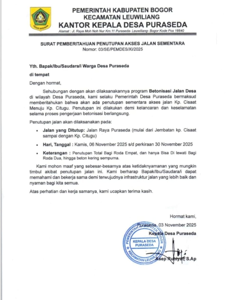 ANGKARANEWS.ID– Pemerintah Desa (Pemdes) Puraseda, Kecamatan Leuwiliang, Kabupaten Bogor, akan menutup sementara akses jalan menuju Kampung Citugu. Kebijakan ini diambil seiring dengan dimulainya program pembetonan jalan desa yang membentang dari Kampung Cisaat hingga Kampung Citugu.