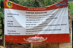 Melalui Bankeu tahap I, Pemdes Karyasari mengalokasikan dana untuk pembangunan TPT sepanjang 275 meter dengan lebar 0,25 meter dan tinggi 2 meter, disertai pengaspalan jalan. Proyek ini dikerjakan selama 60 hari kalender di Kampung Rawa Sari, RW 04.